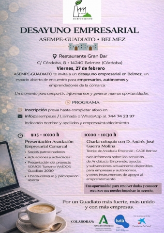 A finales de esta semana, el proyecto dará un paso relevante de cara al sector productivo de la comarca, ya que se presentará oficialmente ante empresas, personas autónomas y emprendedoras en el transcurso de un el desayuno empresarial organizado por ASEMPE-Guadiato en Belmez el viernes 27 de febrero. El encuentro se plantea como un espacio abierto de intercambio para explorar de qué manera los negocios locales pueden incorporar criterios de sostenibilidad y responsabilidad social a sus modelos de funcionamiento, de forma totalmente gratuita.